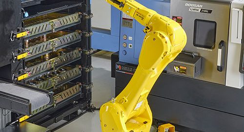 SYNERGi Premier automated manufacturing cell featuring a Doosan machining centre (front load).
