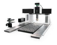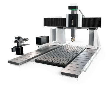 Gantry-type milling machine with moving bridge, fixed table and fixed cross beam.